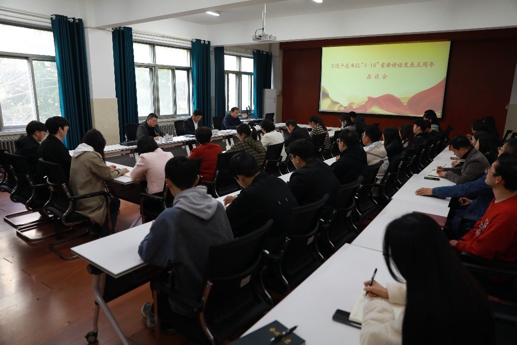 3月15日下午,我校在马克思主义学院会议室召开学习贯彻习近平总书记“3·18”重要讲话精神发表五周年座谈会。会议的主题是重温学习习近平总书记“3·18”重要讲话精神,总结五年来思政课建设经验和取得的进步,分享五年来成长历程和体会,进一步增强责任感使命感,明确改革和发展方向,切实提升思政课教育教学水平。校党委书记任中普出席会议并讲话,党委办公室、马克思主义学院领导班子成员,思政课教师代表、学生代表参加会议。党委宣传部部长李红安主持会议。