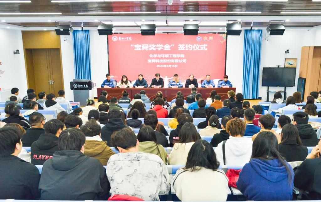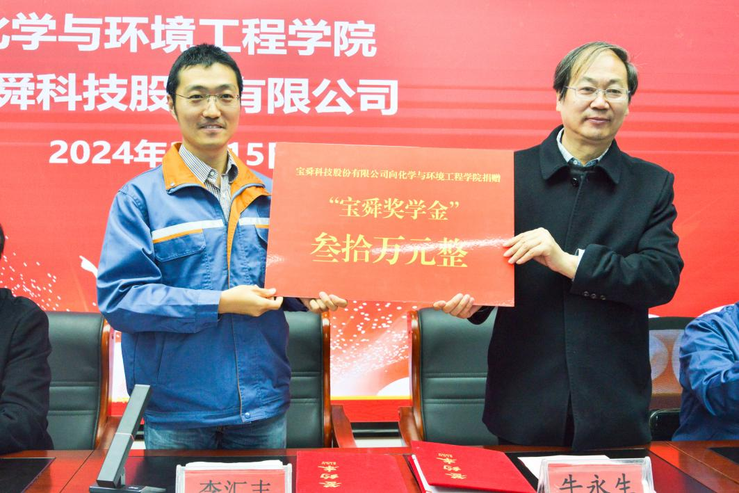 3月15日上午,化学与环境工程学院在A02号教学楼202教室举行“宝舜奖学金”签约暨捐赠仪式,宝舜科技股份有限公司总经理李汇丰、副总经理郝怀玺、总工办总工程师黄诚等,我校工会主席牛瑞庆、化学与环境工程学院党总支书记阎冬、院长牛永生等出席仪式,化学与环境工程学院师生代表共计170余人参加仪式。党总支书记阎冬主持仪式。