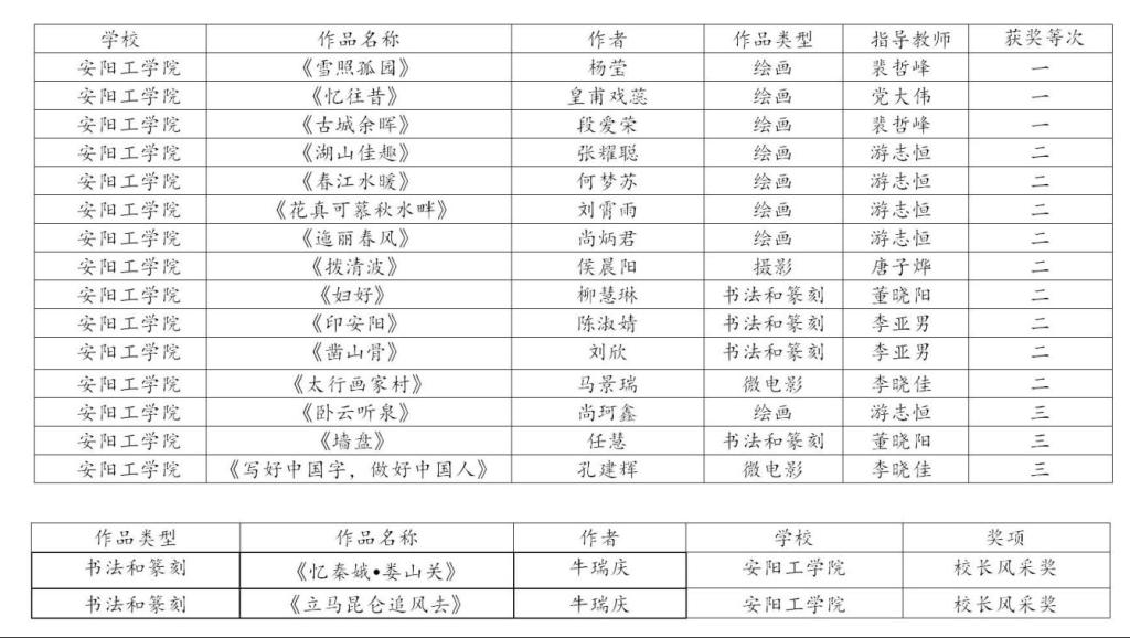 据悉,为了方便广大师生欣赏获奖佳作,向获奖者学习,获奖作品将于我校安阳文化周期间进行集中展示。