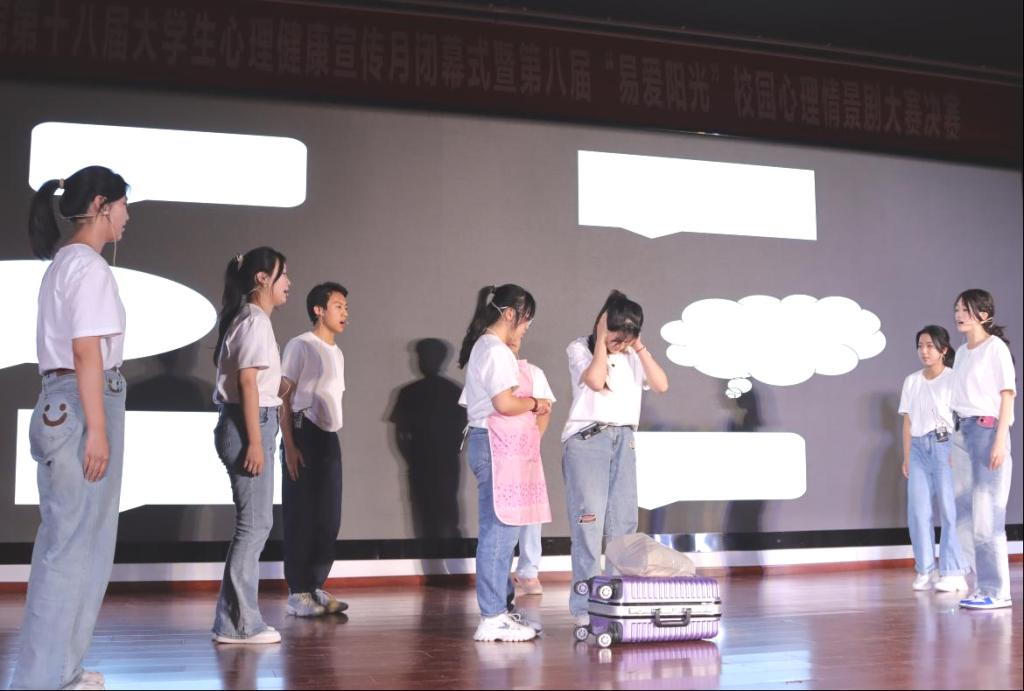 首先进行了第八届“易爱阳光”校园心理情景剧决赛。经过前期的初赛选拔,会计学院等6个学院代表队进入决赛,代表队分别从自我成长、大学生恋爱、人际关系、学习困扰等方面,诠释了当代大学生的内心世界与情感需求。舞台上,演员们倾情演出,将角色的冲突、矛盾和思考生动的演绎出来,展现了同学们关爱心灵健康,勇于突破成长的乐观向上的精神风貌。最终,文化与传媒学院的《为你好》获得一等奖,国际教育学院的《小宇宙的涅槃》和会计学院的《信笺解心扉》获得二等奖,计算机科学与信息工程学院的《做自己》、电子信息与电气工程学院的《百花无高下》和机械工程学院的《社交“汉”匪》获得三等奖。