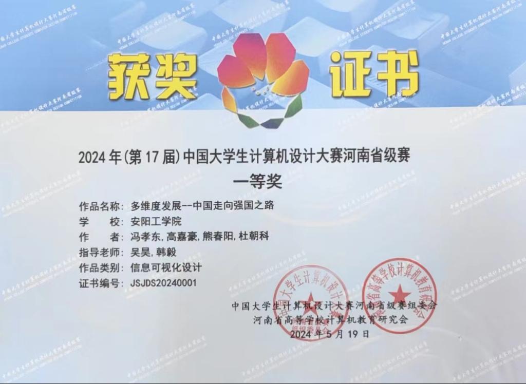 5月17至19日在郑州航空工业管理学院举办的“2024年(第17届)中国大学生计算机设计大赛河南省级赛”圆满落幕。我校计算机科学与信息工程学院(软件学院)派出24支代表队参赛,经过激烈角逐,获得一等奖3项、二等奖3项、三等奖11项的优秀成绩。5月23日,经过省赛组委会反复研讨,最终将5项优秀作品推荐参加国赛。