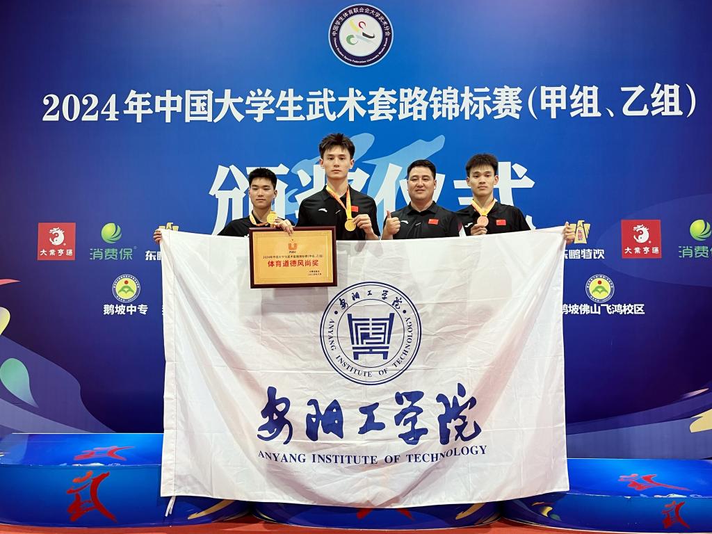 我校由杨振华、陈楠老师带领的参赛队,经过激烈角逐,获得两金一铜、一个第五名的好成绩!其中,飞行学院王志祥同学获得甲A组华拳冠军、甲A组南刀季军,机械工程学院单留博同学获得甲A组地躺拳冠军。我校荣获体育道德风尚奖。