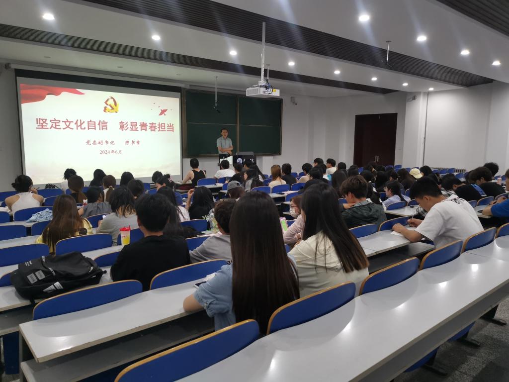 6月19日下午,党委副书记陈书章以《坚定文化自信 彰显青春担当》为题,为文化与传媒学院2022级播音与主持艺术专业、艺术与设计学院2022级绘画(中国画方向)专业学生讲授思政课。
