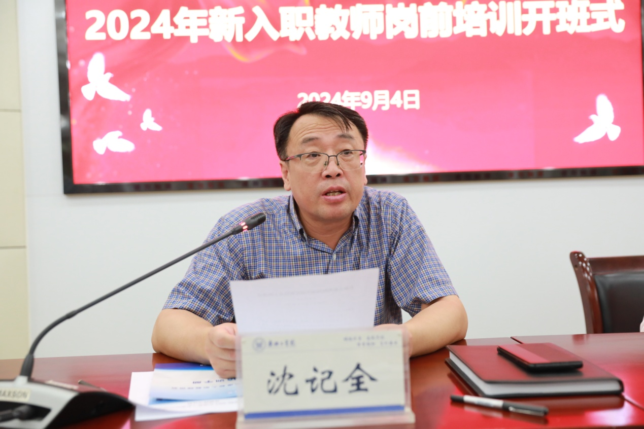 9月4日下午,我校在行政楼四楼会议室举行2024年度新入职教师岗前培训开班仪式。校长沈记全出席开班仪式并讲话,副校长赵卫兵主持会议。宣传部、教务处(教师发展中心)、人事处、学生处、科研处、教评办等部门负责人,各院部院长、教学副院长,71名新进教师及其指导教师参加开班仪式。