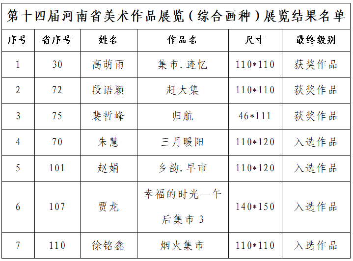 近日,河南省美术家协会官网公布了第十四届河南省美术作品展(综合画种)复评评选结果,我校艺术设计学院7名师生水彩粉画作品在展览中荣获佳绩,含教师作品2幅,在校学生作品5幅。其中,4幅作品入选,3幅作品获奖。我校入选作品总数占安阳市水彩粉画作品入选总数的半数。