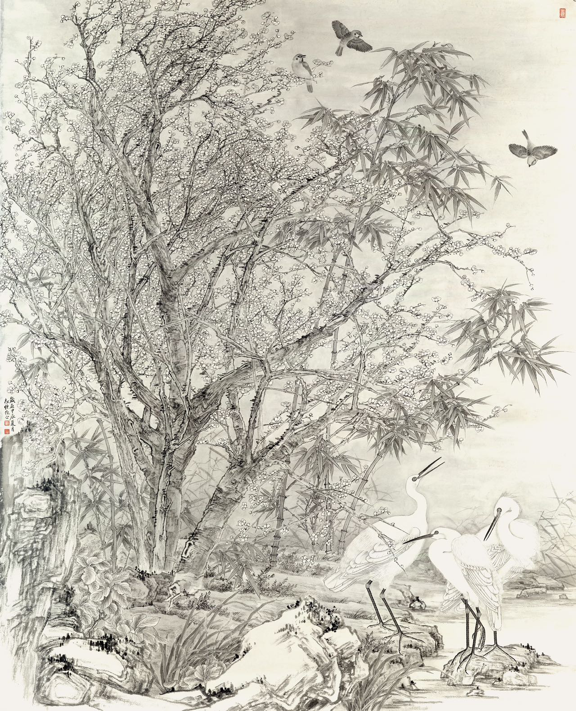 梅竹聚禽220cmx180cm纸本水墨 游志恒作