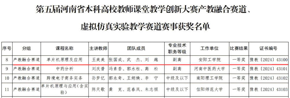 近日,第五届河南省本科高校教师课堂教学创新大赛(产教融合赛道)比赛结果揭晓,我校机械与航空制造工程学院的王美美老师团队参赛课程《单片机原理及应用》荣获一等奖。