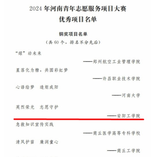 近日,我校“英烈荣光 志愿守护”志愿服务项目在“第七届中国青年志愿服务项目大赛河南赛区选拔赛暨2024年河南青年志愿服务项目大赛”中荣获铜奖。