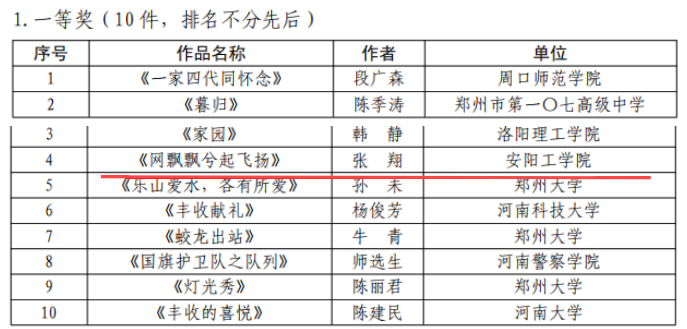 近日,河南省教育厅办公室发布《关于公布全省教育系统离退休干部系列红色作品征集活动获奖名单的通知》,我校退休职工张翔的作品《网飘飘兮起飞扬》获摄影作品一等奖,刘鸣的作品《甲骨文书法》获书法作品三等奖。