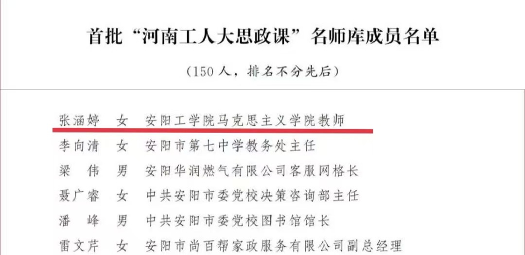 近日,河南省总工会公布了首批“河南工人大思政课”名师库成员名单,我校马克思主义学院教师张涵婷成功入选。