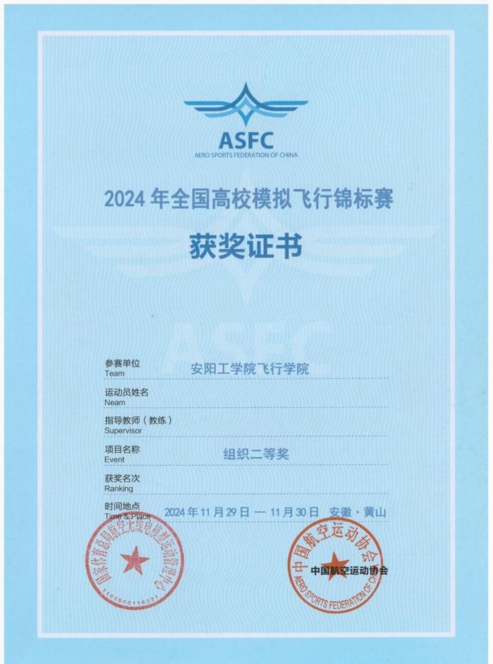 11月28日至12月2日,由国家体育总局航管中心、中国航空运动协会联合主办“2024全国高校模拟飞行锦标赛”在安徽黄山举办。我校荣获一等奖5项、二等奖7项、三等奖2项,马明霞、谷扬、冯魁老师获“优秀指导教师”,飞行学院获“组织二等奖”。