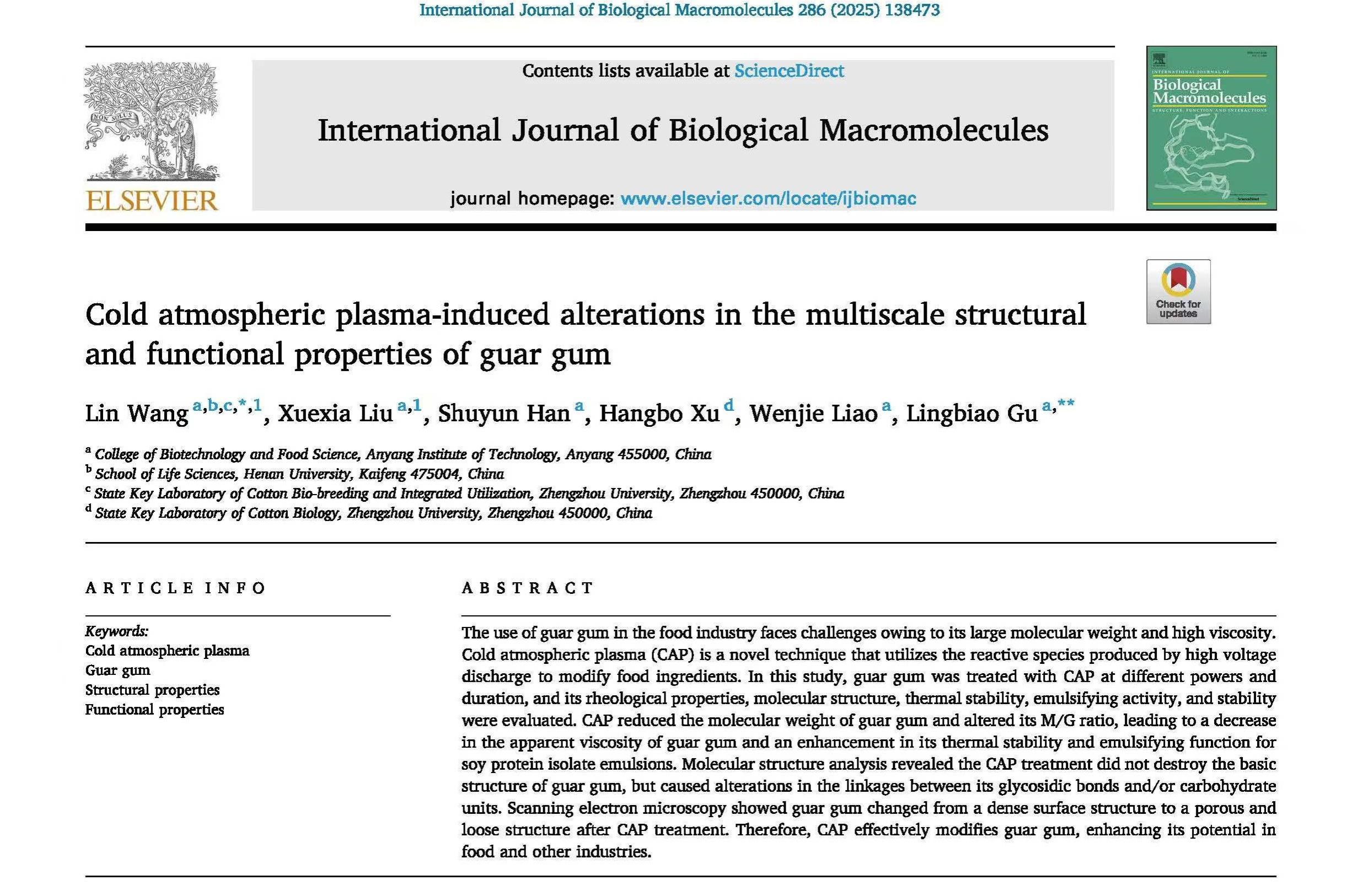 近日,我校生物与食品工程学院王琳、刘雪霞博士为共同第一作者,谷令彪博士为通讯作者,在国际知名期刊《International Journal of Biological Macromolecules》(中科院一区,TOP期刊,影响因子7.7)发表题为“Cold atmospheric plasma-induced alterations in the multiscale structural and functional properties of guar gum”的最新研究成果。此项研究深化了对改性多糖功能活性的理解,为低温等离子体技术在绿色改性多糖领域的应用提供了新的视角。