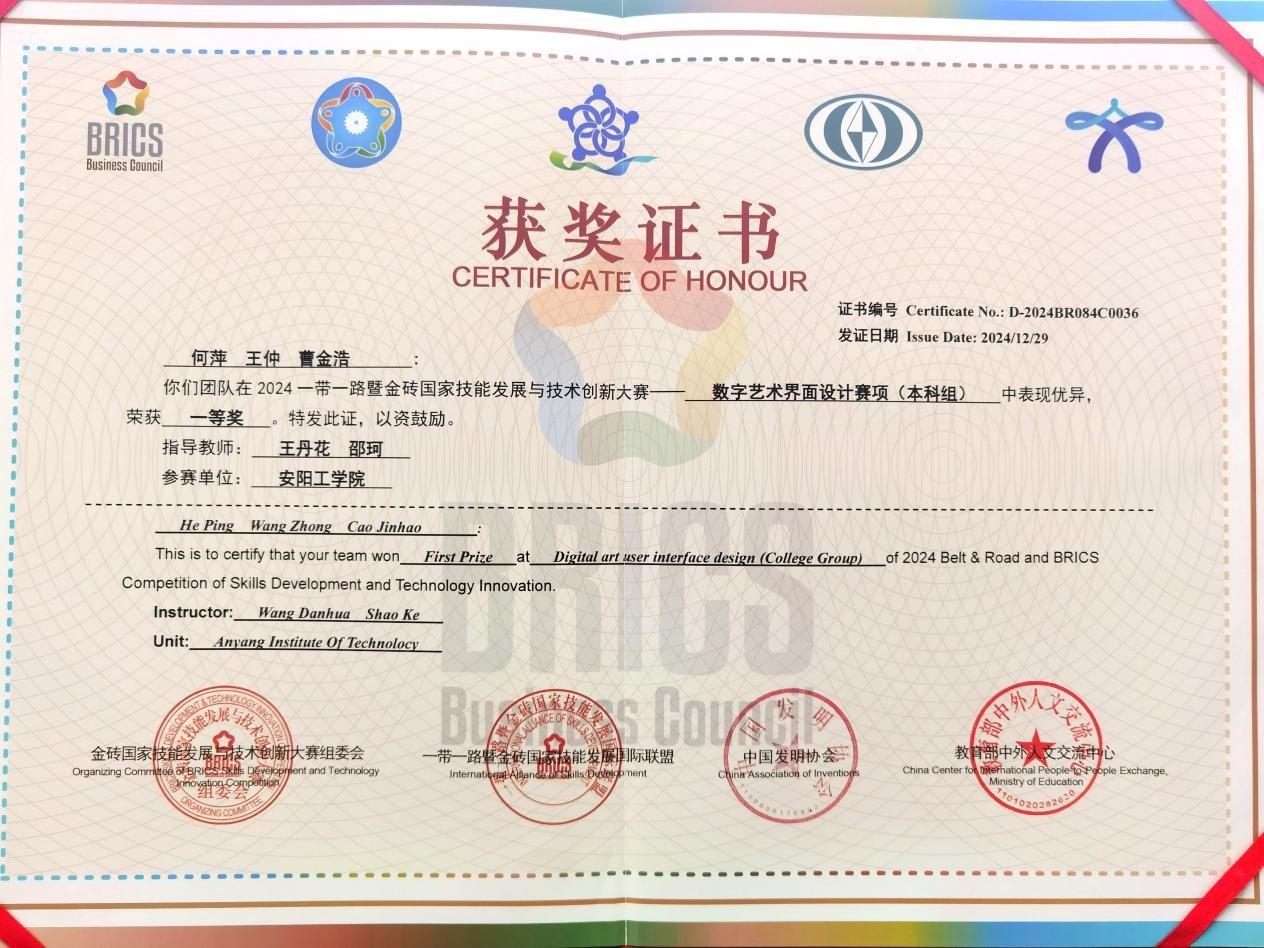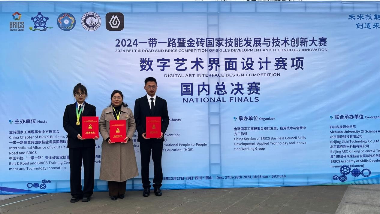 12月27-29日,2024“一带一路”暨金砖国家技能发展与技术创新大赛数字艺术界面设计赛项国内赛决赛在四川成都举办。我校艺术设计学院何萍、王仲同学组成的代表队荣获全国总决赛一等奖,王丹花、邵珂两位老师获优秀指导教师奖,我校获最佳组织奖。