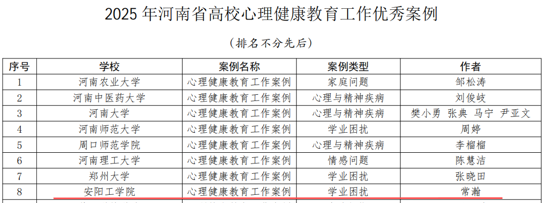 近日,河南省委教育工委、河南省教育厅公布2025年河南省高校大学生心理健康教育优秀课程与工作案例遴选结果,我校心理健康教育中心教师常瀚申报的课程《与压力共舞,筑梦青春成长》及工作案例《高考复读失利引发的发展性适应障碍干预案例》入选。