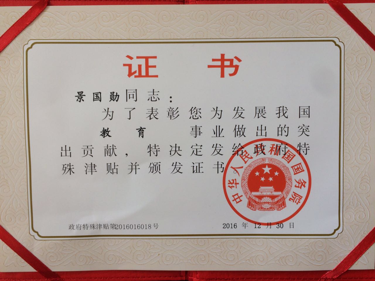 经国务院批准,根据人力资源和社会保障部《关于公布2016年享受政府特殊津贴人员名单的通知》(人社部发〔2016〕136号),我校景国勋教授入选,成为“享受国务院政府特殊津贴”专家。