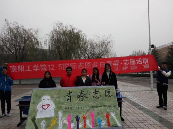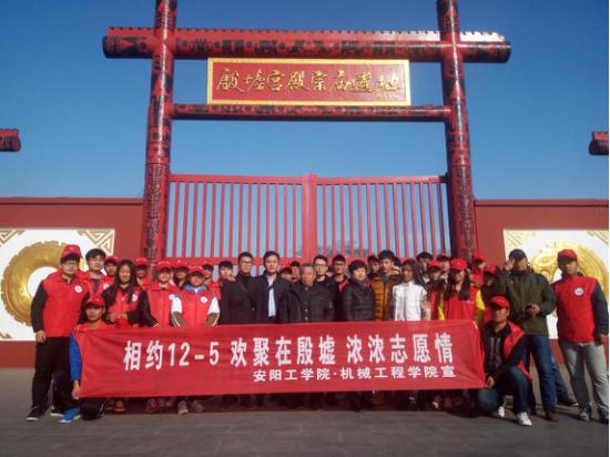 机械工程学院常青志愿者服务队在殷墟开展以“相约12.5,欢聚在殷墟,浓浓志愿情”为主题的宣誓签名仪式;数理学院青年志愿者12月5日早晨六点为学校周边的环卫工送去了温暖的早餐,并帮助他们打扫卫生;电子信息与电气工程学院、计算机科学与信息工程学院青年志愿者在丽豪社区和峨眉社区开展了维修手机家电、清扫街道的活动;艺术设计学院青年志愿者在东风路与黄河大道交叉口开展维护交通秩序、劝导不文明交通行为的文明交通活动;暖爱青年志愿者协会和爱馨义工协会的青年志愿者分别来到安阳市博爱特教中心和安阳市儿童福利院为小朋友们送去了欢笑和温暖;社团联合会青年志愿者来到安阳市公交总站开展了清扫公交车的活动;经济管理学院、文法学院、土木与建筑工程学院、国际教育学院、飞行学院、化学与环境工程学院、生物与食品工程学院的青年志愿者分别在校内图书馆、教学楼、至善湖旁等处开展了一系列的志愿服务活动。
