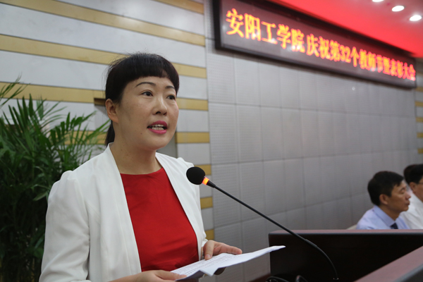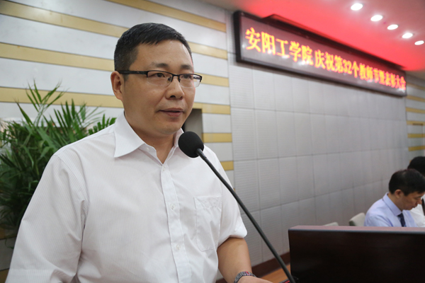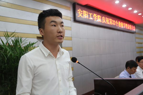 获奖教师代表闫春岭老师、获奖辅导员代表杨聪聪老师分别上台发言,学生代表陈实代表全校学生向老师们表达了节日的祝福。