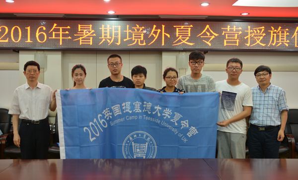 校长景国勋、副校长李学志为英国提赛德大学夏令营授营旗