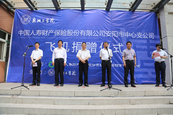 5月25日上午,中国人寿财产保险股份有限公司安阳市中心支公司向我校捐赠飞机,仪式在飞行学院举行。安阳市人民政府副市长刘建发,中国人寿财产保险公司安阳中心支公司党委书记、总经理何军,安阳市体育局局长郭聚法,我校党委书记任中普、校长景国勋、副校长李学志出席。校长办公室、飞行学院等相关部门负责人及飞行学院飞行技术专业学生代表120余人参加仪式。副校长李学志主持仪式。