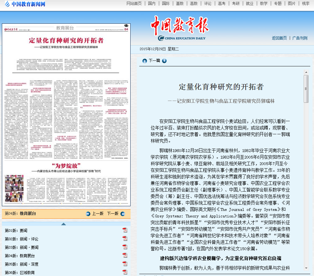 近日,中国教育报刊登了我校生物与食品工程学院郭瑞林研究员先进事迹,详细介绍了他30多年来矢志不渝,坚持奋战在农业科研、生产和教学第一线,为农业增产、农民增收和定量化育种研究做出的贡献。长期以来,郭瑞林研究员甘于清贫,淡泊名利,苦心孤诣,开拓进取,在作物育种研究领域独辟蹊径,他提出的定量化育种理论包括农业模糊理论、灰色育种理论和同异理论一枝独秀,别具特色,在作物育种界产生了较大影响,对于实现由传统经验育种向定量化、信息化和科学化育种的跨越具有重要意义。