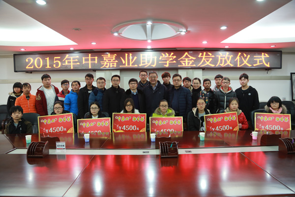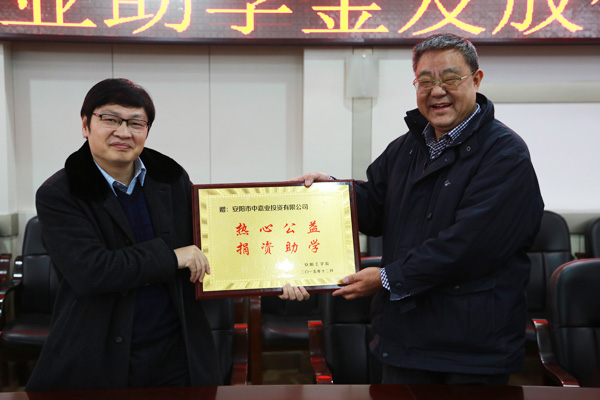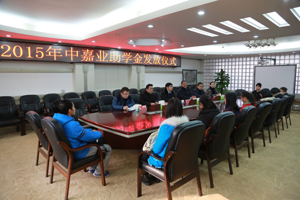 12月30日下午,我校在行政楼二楼会议室举行2015年“中嘉业”助学金发放仪式。副校长李学志、安阳中嘉业投资有限公司副总经理杨增建出席,安阳中嘉业投资有限公司、我校学生处相关负责人及获得中嘉业助学金的学生参加仪式,仪式由学生处副处长刘冰主持。