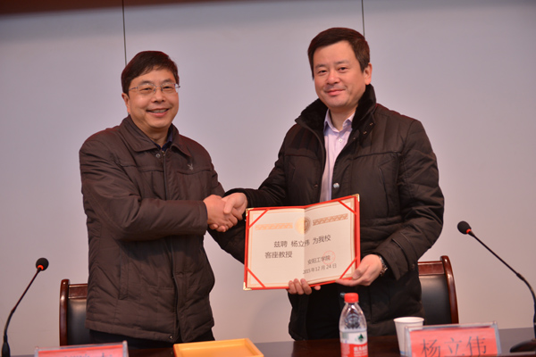 副校长万鹏杰代表学校为杨立伟教授颁发客座教授聘书
