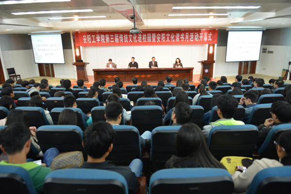 校党委副书记杨培为开幕式致辞并宣布读书月活动开幕。杨培说,“安阳文化进校园”是我校的办学特色和品牌工程,我校立足安阳丰富深厚的优秀传统文化,密切联系大学生思想实际,积极开展特色文化育人,取得了显著的成绩。此次读书活动,希望广大学生要读进去,读出“味”,把安阳地方优秀的传统文化读懂、读透,读出新意;希望各有关单位和各学院高度重视此项活动,加强交流,密切合作,丰富载体,创新方式,营造浓厚的活动氛围,努力在校园中形成浓郁的阅读风气、良好的阅读习惯和健康的阅读文化。