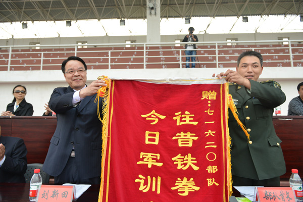 校党委副书记刘新田代表学校党委、行政,向大力支持我校军训工作的71620部队首长和全体教官表示衷心的感谢,向在军训期间付出辛劳的老师和同学表示诚挚的慰问,并向71620部队赠送了锦旗。他强调,军训能够培养学生顽强守纪的优良品格,增强学生爱国主义与集体主义观念,强健体魄,提高学生综合素质,希望同学们在今后的大学生活中,继续发扬军训中的好精神、好作风,严于律己,诚恳待人,好好学习,勇于担当,为今后走向社会报效祖国打下坚实的基础。