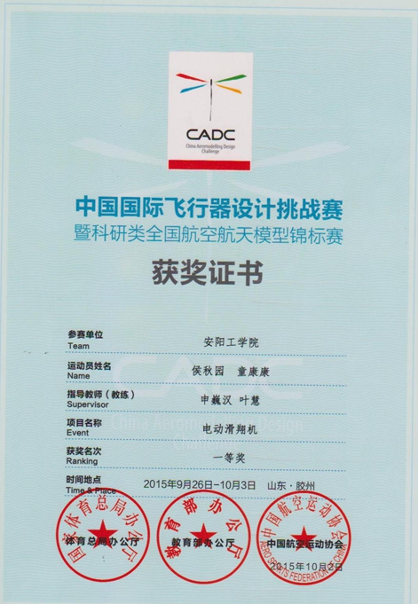 2015年科研类全国航空模型锦标赛于9月26日至10月3日在山东胶州举行。我校飞行学院航模队队员侯秋园、童康康同学电动滑翔机项目中荣获一等奖。