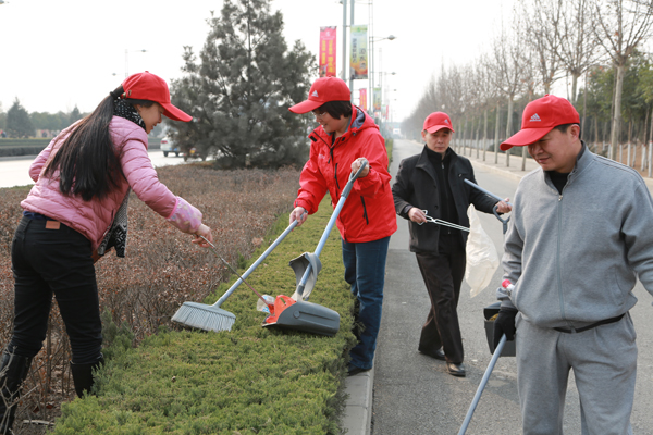 为做好2015年迎接国家卫生城市复审的各项工作,3月14日上午,副校长张玲、纪委书记路阳带领校党委办公室、组织部、宣传统战部、纪委(监察审计处)、后勤管理处等部门工作人员30余人对我校分包的彰德路黄河大道交叉口至安林高速入口处路段的卫生进行了整治清理。