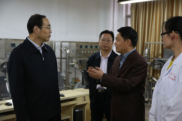 调研中,校长任中普首先代表学校对丁巍书记的到来表示热烈欢迎,并简要介绍了学校教学科研、专业建设、校园文化等相关情况。在化工学院科研室,丁巍与科研室老师亲切交谈,了解他们的工作开展情况和学校仪器设备的购置情况,询问他们有什么困难和问题。丁巍指出,安阳市正处在一个转型发展阶段,教育事业也需要在经济的转型发展中得到发展,高校要结合产业升级加强专业建设,为打造安阳经济升级版、加快建设中原经济区区域性中心强市提供智力和人才支撑。他还赞扬了我校在应用型本科转型发展中的工作,并希望在教学科研一线的专业教师为学校的发展、安阳的发展多作贡献。