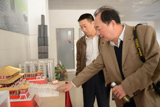 何白鸥观看土建学院学生建筑模型作品“含元殿”