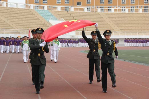 伴随着嘹亮的国歌声,2013级军训会操大会正式开始。校长任中普对2013级参训学员进行了检阅。在庄严的迎校旗仪式后, 2013级新生组成的16个受阅方队以饱满的精神状态展示军训成果。