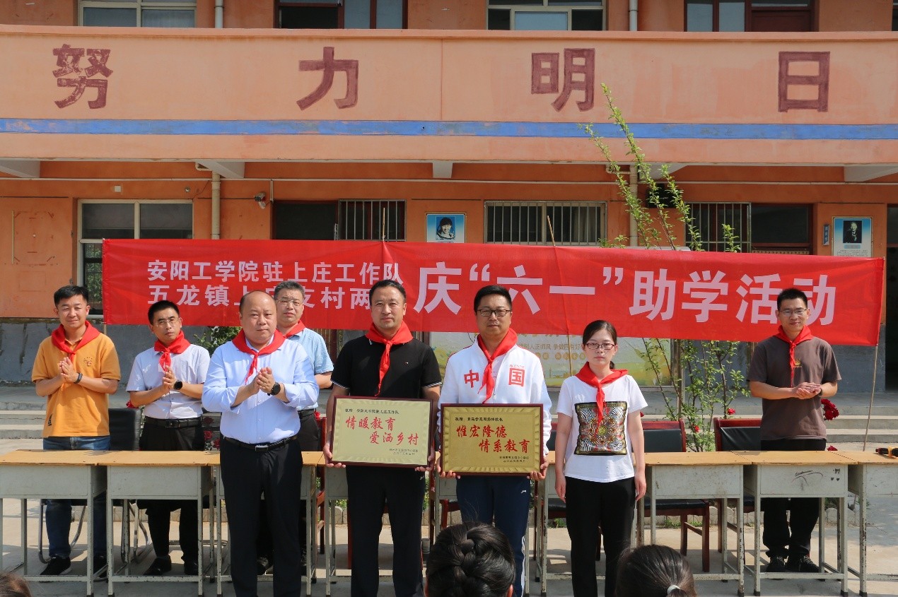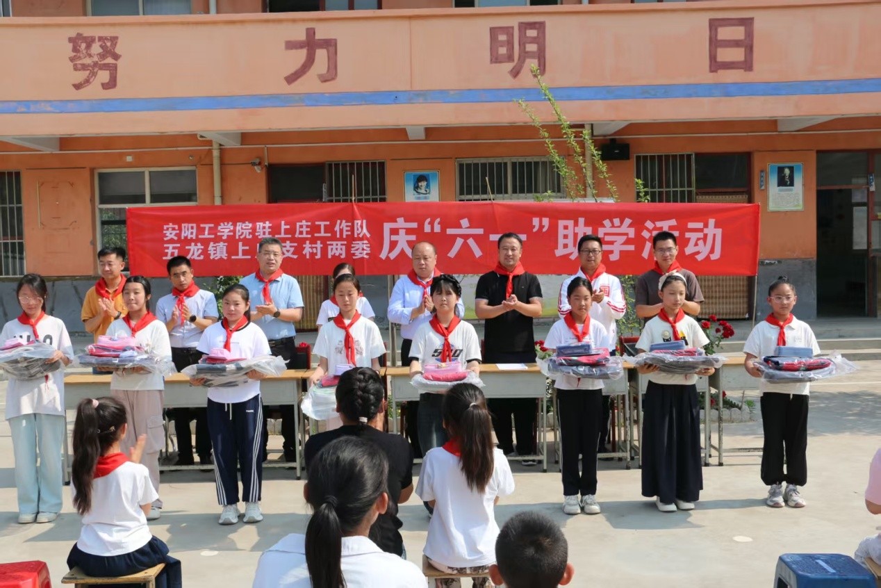 5月27日,在“六一”国际儿童节来临之际,驻林州市五龙镇上庄村工作队联合我校优秀校友,在上庄小学举办“迎六一”助学活动。五龙镇党委副书记、镇长姜凯,五龙镇武装部部长赵颜,五龙镇中心学校校长郭海增,上庄村党支部书记李长俊等出席活动。
