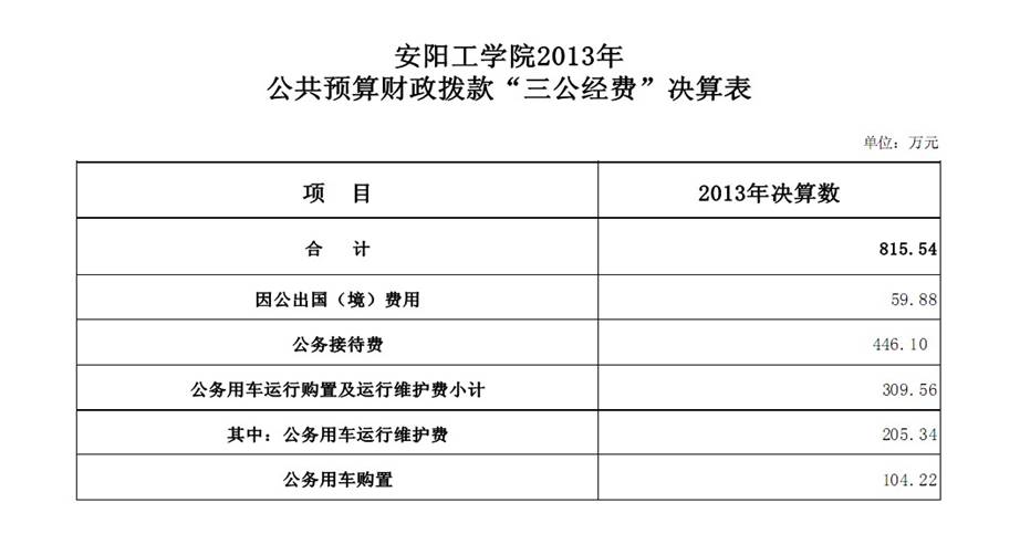 2013年三公经费总额815.54万元,其中:公务接待费446.10万元,比上年度压缩18.24%;出国(境)费用59.88万元(新西兰、澳大利亚5人、支出27.5万元,俄罗斯、芬兰、瑞典4人、支出19.64万元,台湾7人、支出12.74万元),比上年度压缩-33.51%;公务用车运行维护费205.36万元、比上年度压缩-11.87%,2013年核定一般公务用车编制24辆,新增车辆购置费104.22万元。