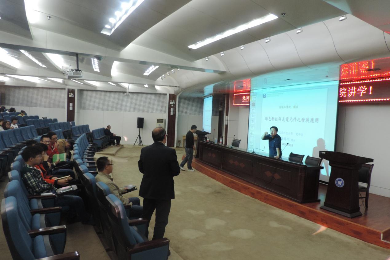 报告会上,杨教授分析了维护自然环境与资源以及减低人类活动带来的负面影响,论述了永续发展在解决环境问题时必须符合社会公平、经济允许和环境健全的准则。同时,杨教授还介绍了绿色科技的领域范畴、以及绿色科技在光电元件上的发展应用,特别是太阳能电池的三代发展历程。报告结束后,杨教授还和与会师生进行了互动交流。