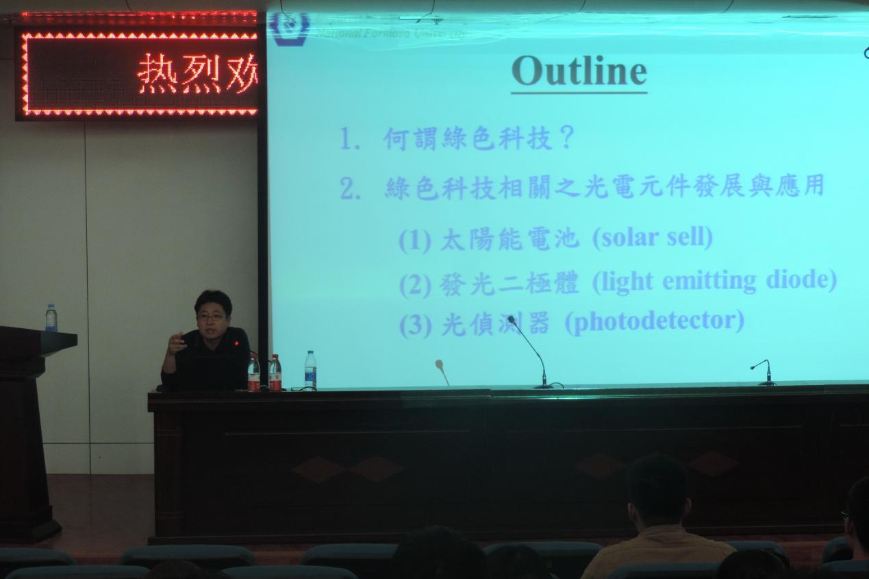 10月19日下午,应数理学院邀请,台湾虎尾科技大学杨胜州副教授在艺术楼报告厅为数理学院200余名师生作了题为《绿色科技与光电元件之发展应用》的学术报告。