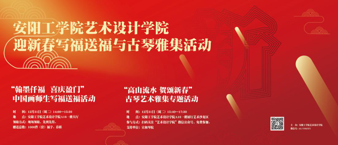 2020年新春到来之际,艺术设计学院将于12月31日下午举行“迎新春”系列活动,活动包括两大模块:“翰墨仟福 喜庆盈门”中国画师生写福送福活动与“高山流水 贺颂新春”古琴艺术雅集。其中写福送福活动由艺术设计学院中国画专业师生与校外书法家共同挥毫,将在现场送出“福”字、春联共计1000套;古琴艺术雅集活动邀请安阳古琴名家王献东先生携弟子举行古琴演奏。
