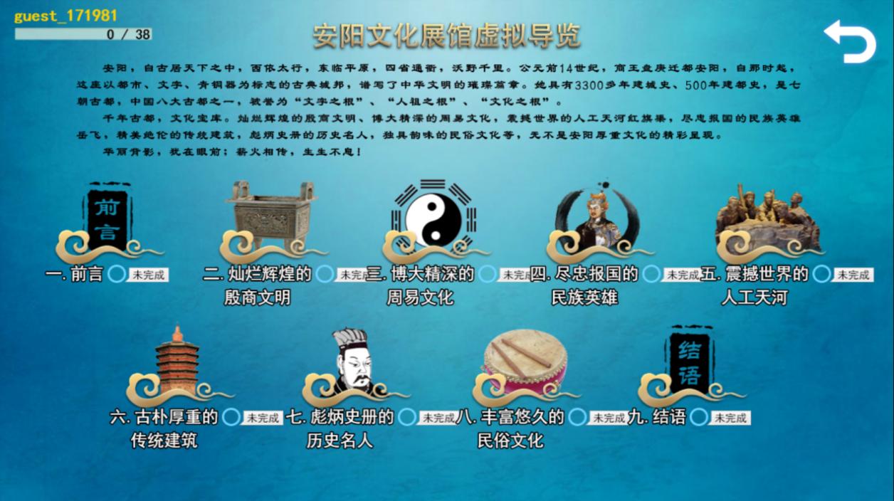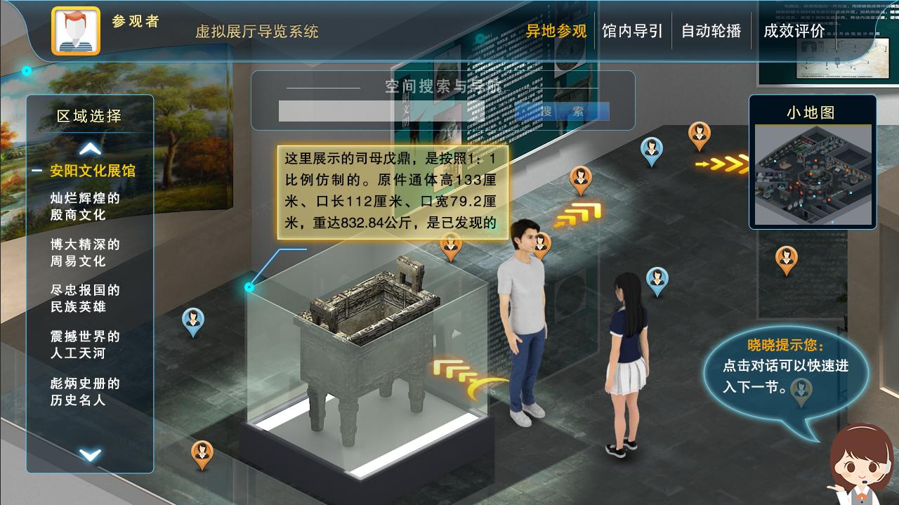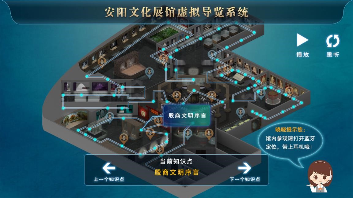 为更好发挥“安阳文化展馆”的功能和作用,积极引进先进技术手段,以青少年喜闻乐见的创新形式和途径,实现线上、线下双重智能化服务:在线上,为不能来到展厅的用户提供线上的智能导览讲解、在线知识闯关等服务;在线下,为到馆参观的用户,采用创新的室内定位技术手段,提供无人值守的跟随讲解服务。