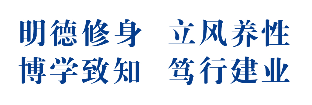 校训融汇先贤哲思,融入时代精神,高度概括了学校的办学理念、治校方略。“明德修身”与“立德树人”根本任务和“德智体美劳”发展目标相统一,强调以德为先,先修德再修学,注重涵养思想品德、价值观念、人文素养,常省己身、常怀家国;“立风养性”强调的是校风、教风、学风的树立和学生性格的养成,注重顶层设计、制度建设、言传身教,见贤思齐、沉凝底蕴;“博学致知”是指在做学问时,要博览群书、博采众长、博涉诸事、勤学善思、知行合一;“笃行建业”是指在做事情的态度和精神方面,能学以致用、扎实做事、深入钻研、勇于创新、建功立业!