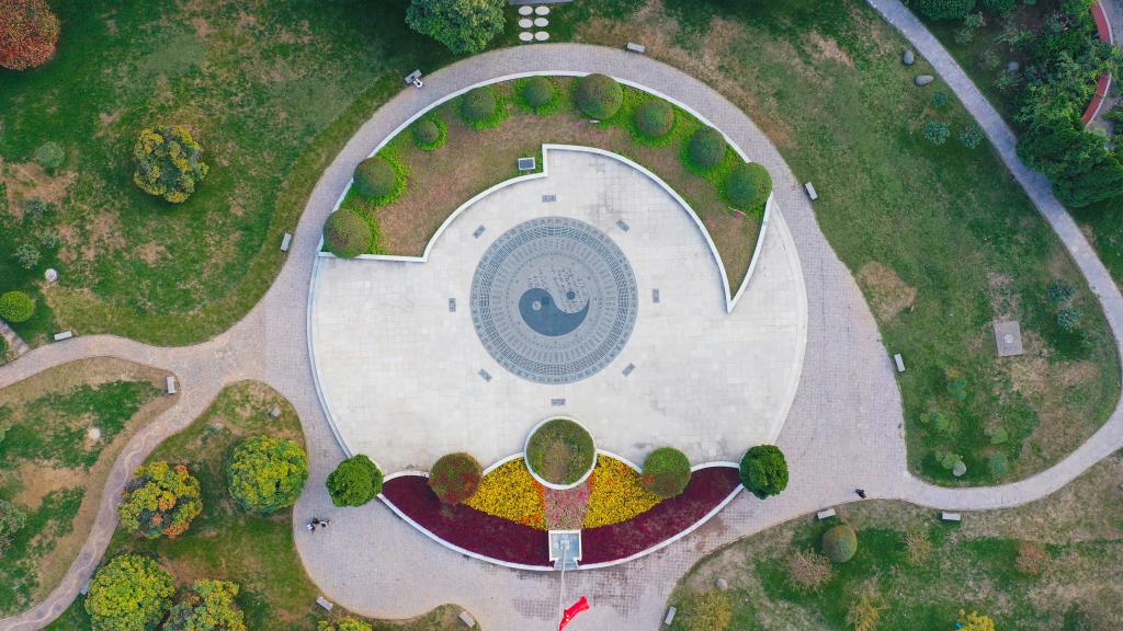年轮广场是一座下沉式圆形广场,从西面向东渐进式螺旋深入,逐步出现三层台阶,循着圆盘走台阶高度降低,层数增加,但其总高度与三层台阶基本持平。好像树木的年轮一样,故名为“年轮广场”。广场地面图案是六十四卦简化的时位图,时间、方位、人、事构成了一个运转不息的四维空间。
