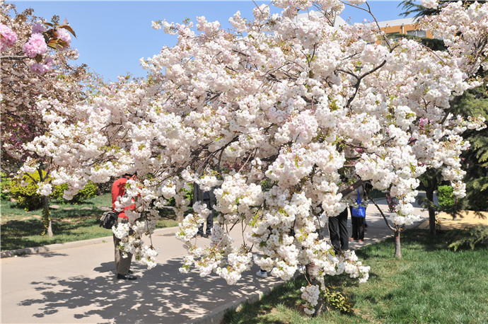 樱花盛开 花团锦簇,在春日沐浴下的樱花竞相盛开,引得师生们驻足欣赏。 四月